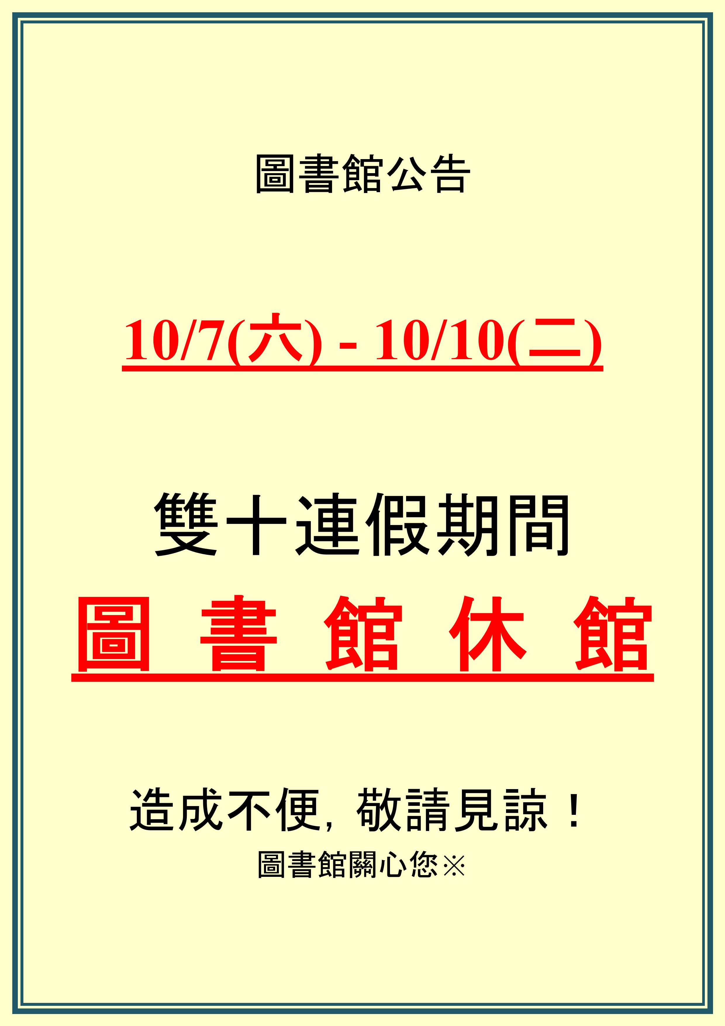 ─ 【圖書館公告】圖書館雙十連假休館</title>