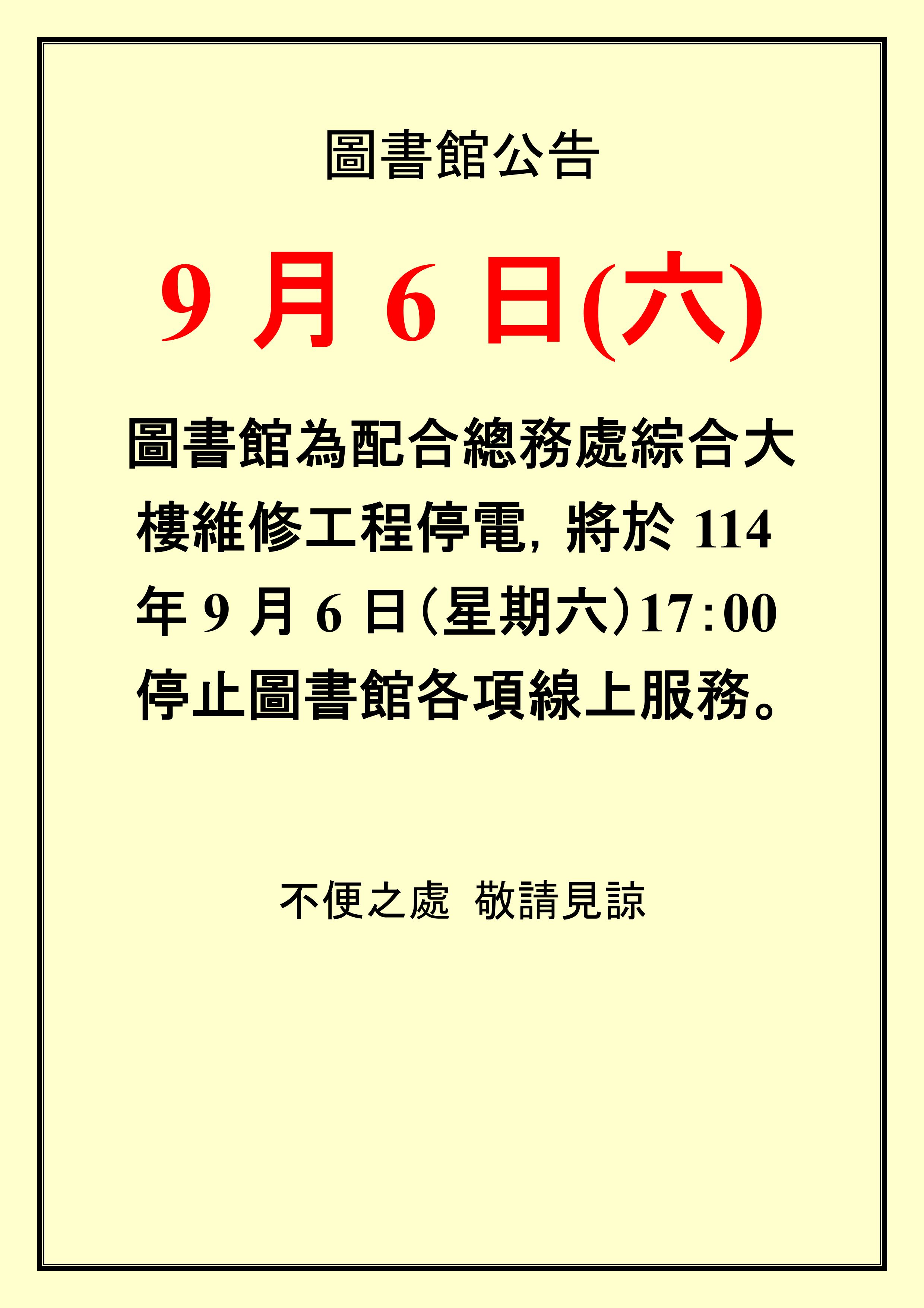 ─ 圖書館為配合總務處綜合大樓維修工程停電，將於114年9月6日（星期六）17：00停止圖書館各項線上服務，不便之處 敬請見諒。</title>