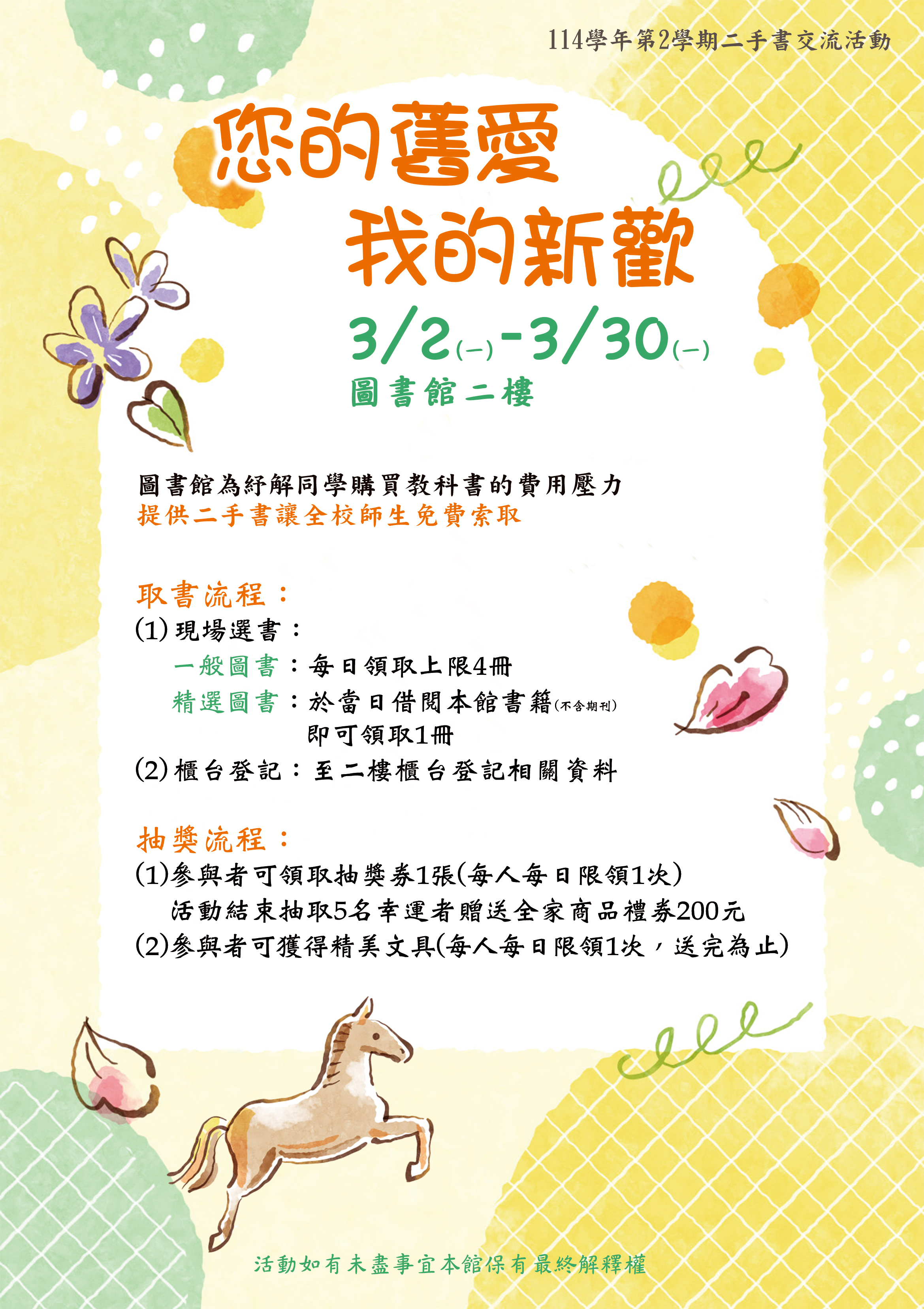 ─ 114學年第2學期「您的舊愛，我的新歡」二手書交流活動，歡迎全校師生踴躍參與</title>
